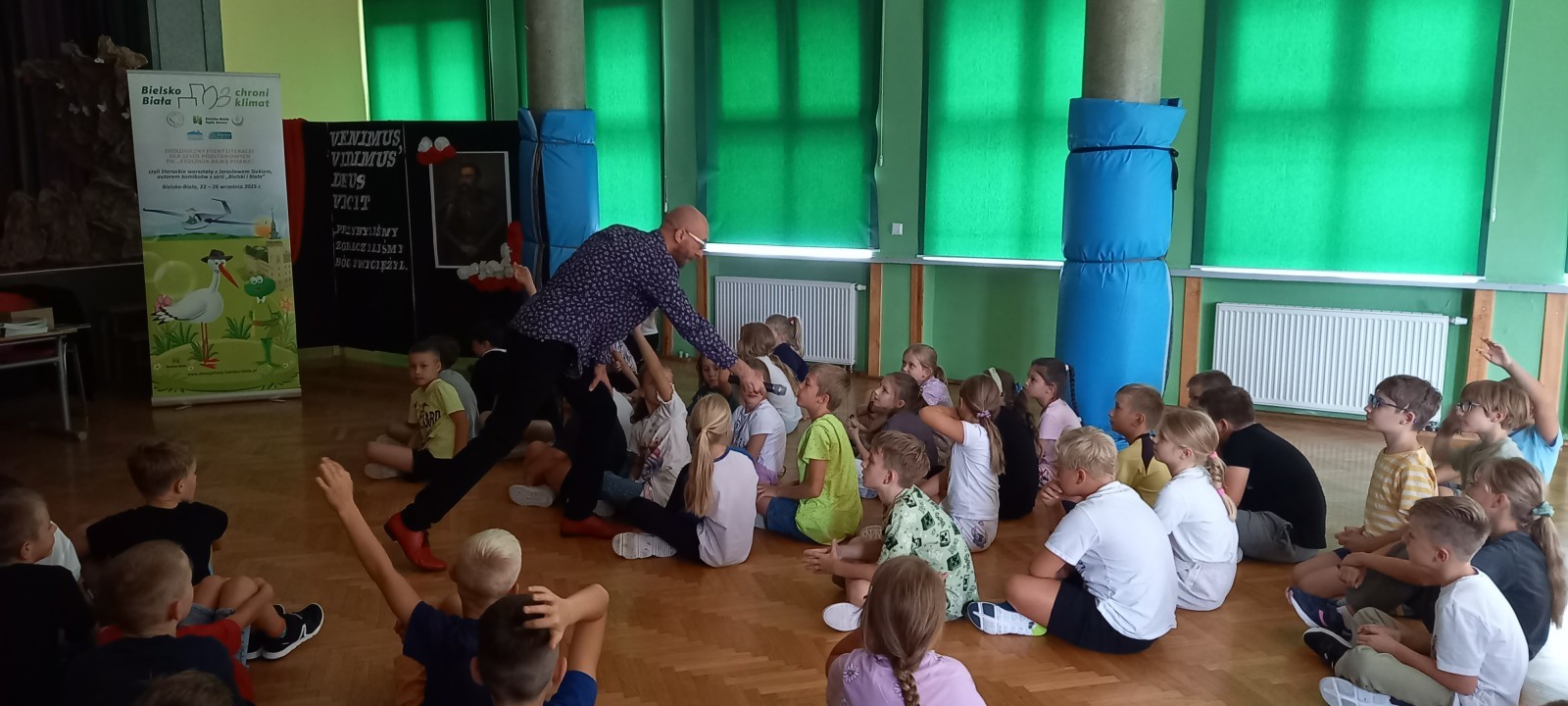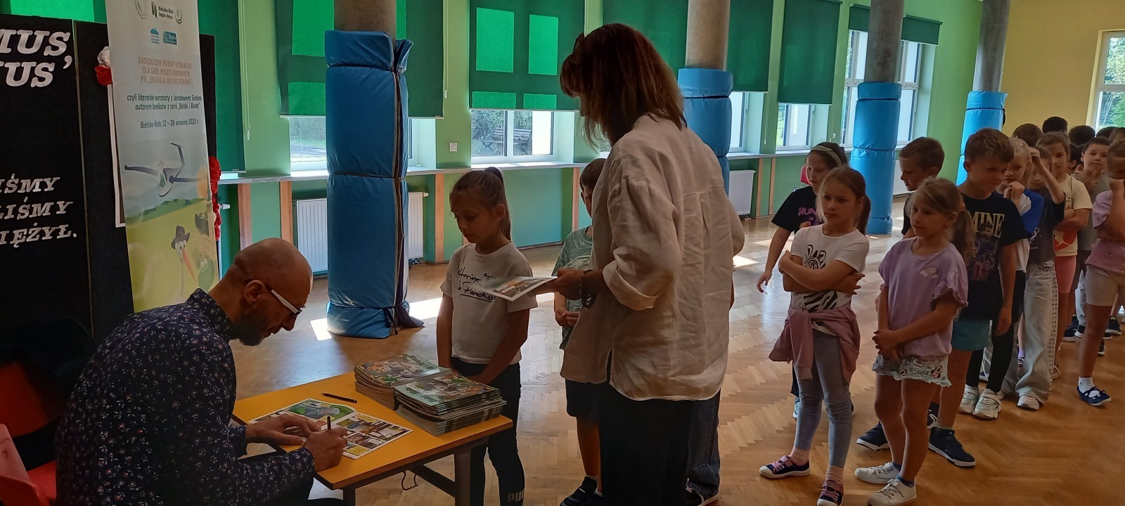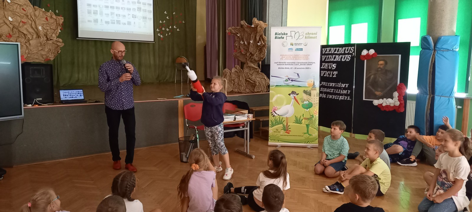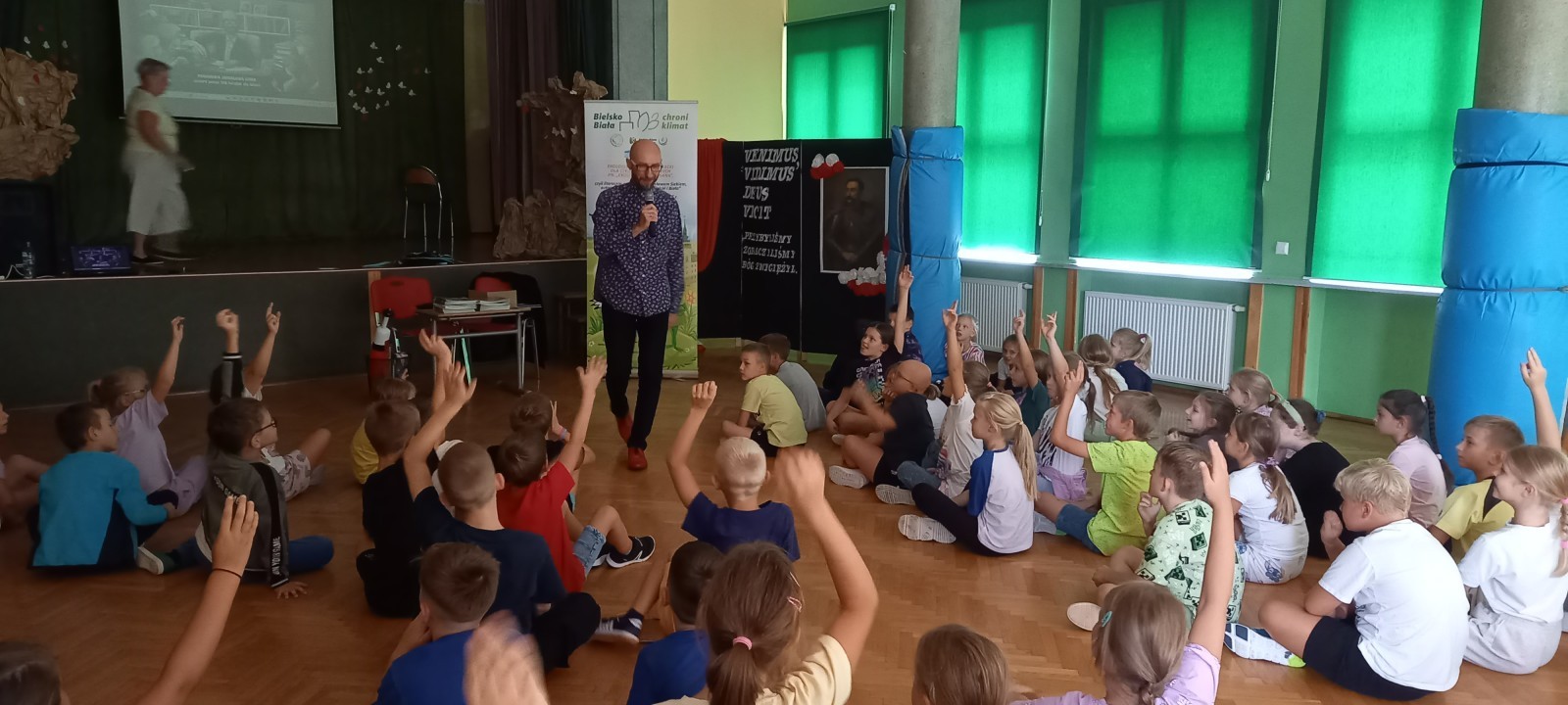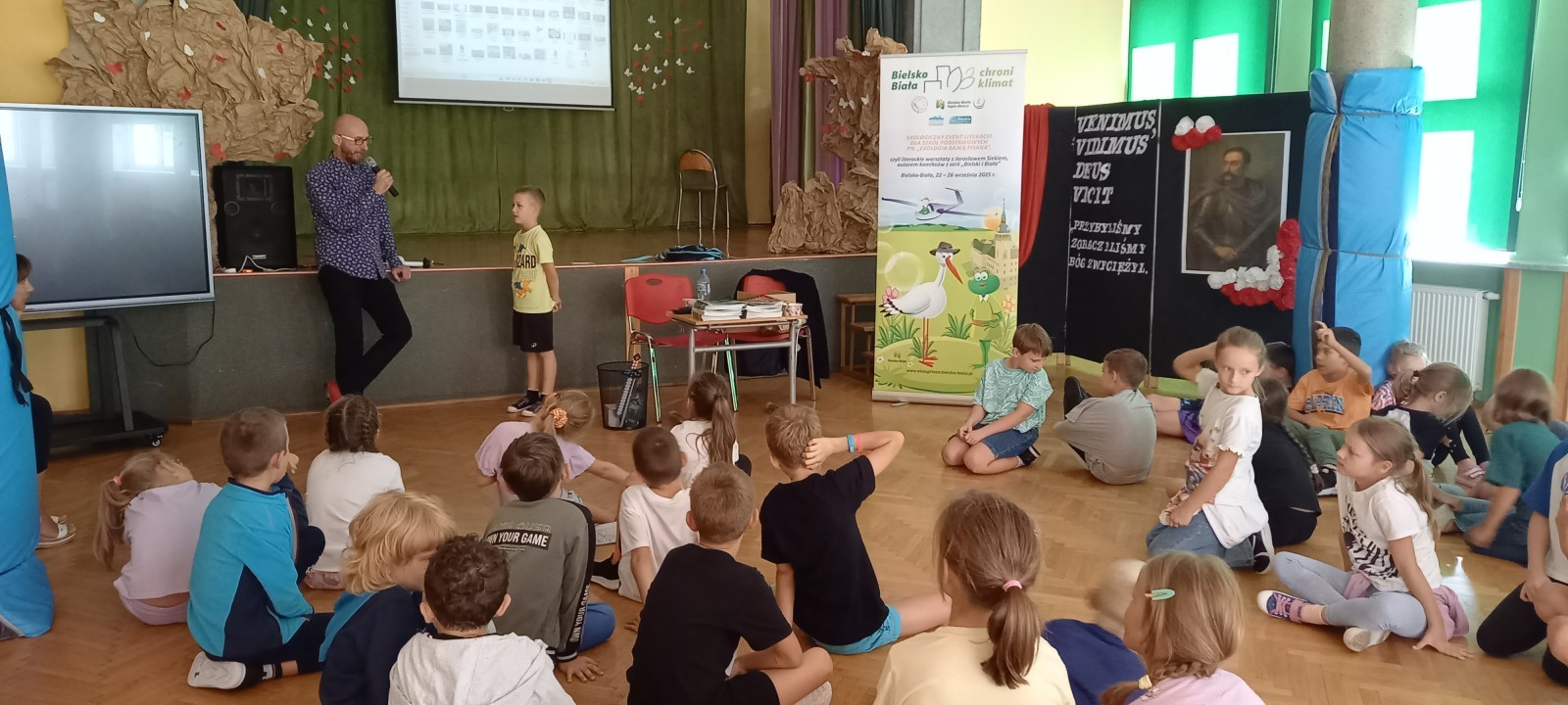 W dniu 22 września w szkolnej auli odbyło się wyjątkowe wydarzenie. Urząd Miejski w Bielsku – Białej, za ogromne zaangażowanie społeczności naszej szkoły w 15 edycji konkursu „Szanuj energię, chroń klimat” w ramach nagrody ufundował Ekologiczny Event Literacki z Panem Jarosławem Siekiem pod nazwą „Ekologia bajką pisana”, czyli literackie warsztaty z autorem komiksów z serii „Bielski i Biała”. Uczestniczyli w nich wychowankowie szkolnej świetlicy – uczniowie klas drugich i trzecich.