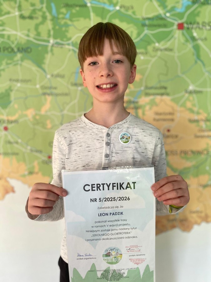 Leon przeszedł 10 wyznaczonych tras, dzięki czemu uzyskał tytuł Szkolnego Globtrotera oraz otrzymał dyplom i unikatową odznakę.