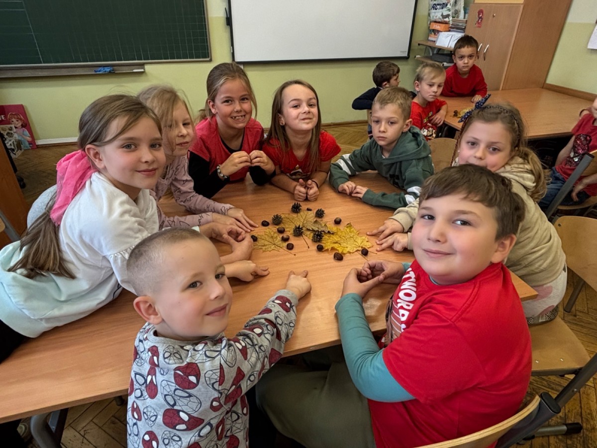 W listopadzie uczniowie klasy 1b pod opieką swojej wychowawczyni pani Anny Sądej, wzięli udział w twórczym działaniu plastyczno-przyrodniczym polegającym na układaniu mandali z jesiennych darów natury. Wykorzystali do tego różnorodne materiały: szyszki, kasztany, żołędzie oraz barwne liście.