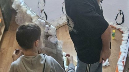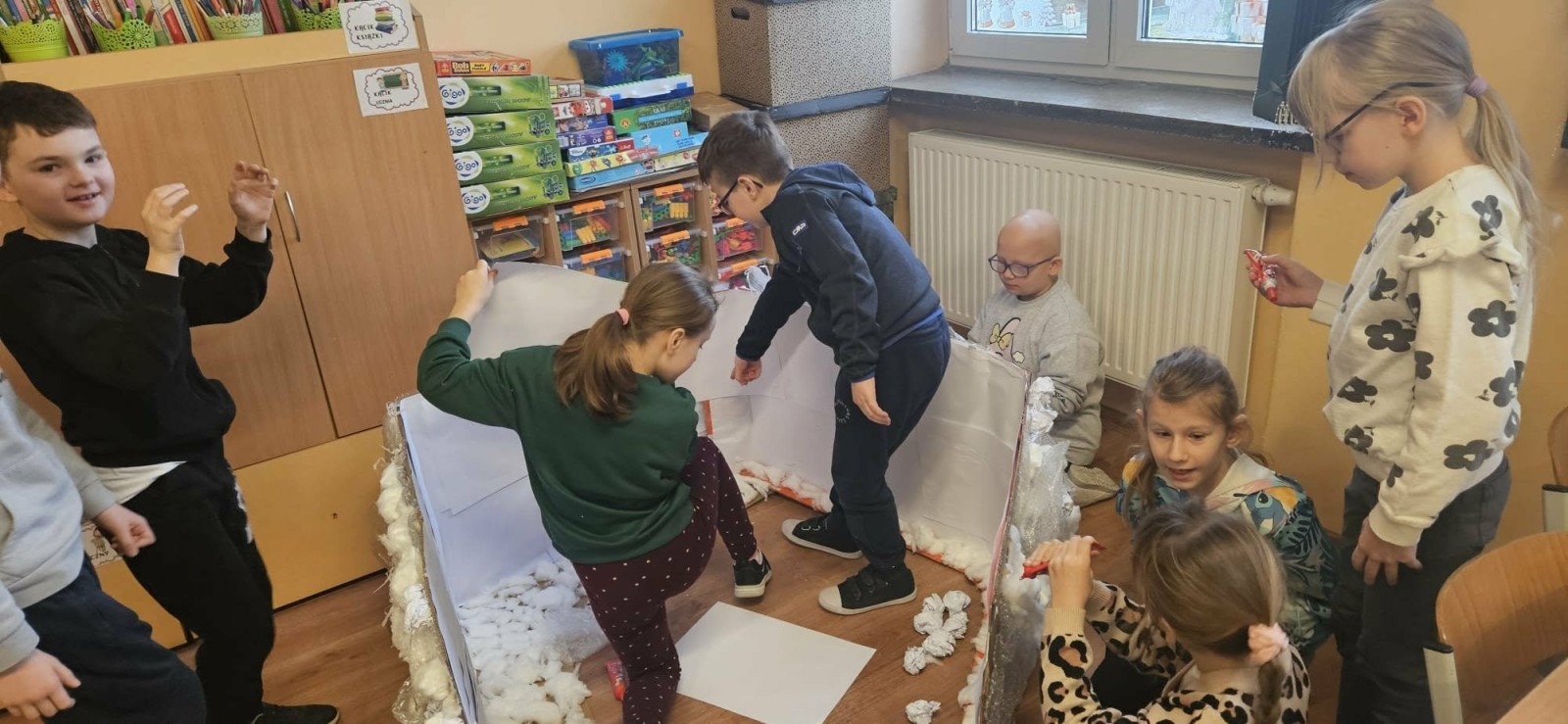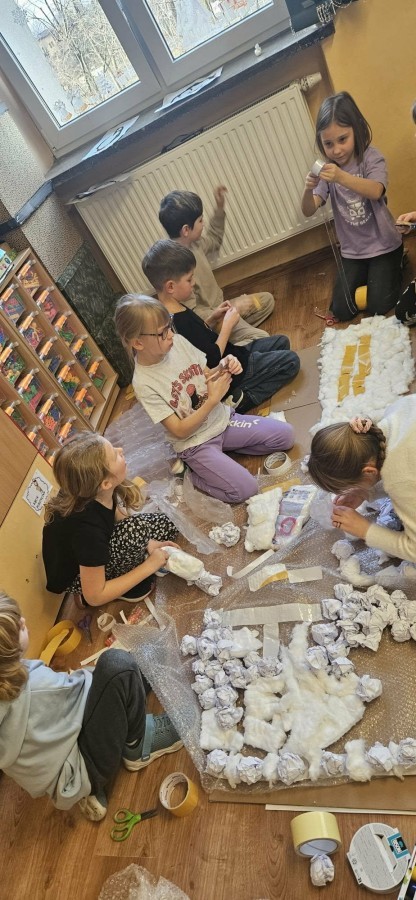 Makieta została wykonana z materiałów pochodzących z recyklingu – kartonów, rolek po papierze, folii bąbelkowej, papieru i waty. Dzięki temu uczniowie przekonali się, że przedmioty, które często trafiają do kosza, mogą zyskać drugie życie i stać się elementem ciekawej pracy plastycznej.