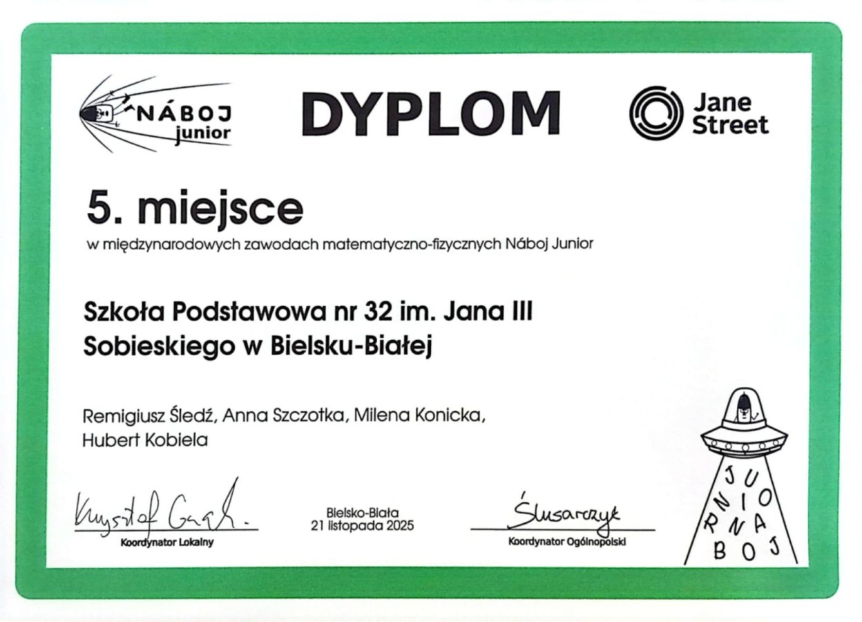 21 listopada 2025 roku drużyna Naszej Szkoły wzięła udział w prestiżowych międzynarodowych zawodach matematyczno-fizycznych Náboj Junior, które odbywały się w V Liceum Ogólnokształcącym w Bielsku-Białej. W konkursie rywalizowały zespoły z wielu krajów, rozwiązując w szybkim tempie zadania wymagające logicznego myślenia, umiejętności matematycznych oraz wiedzy z zakresu fizyki.