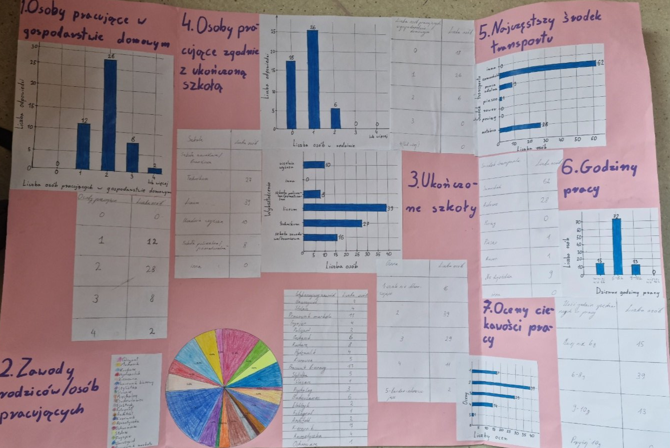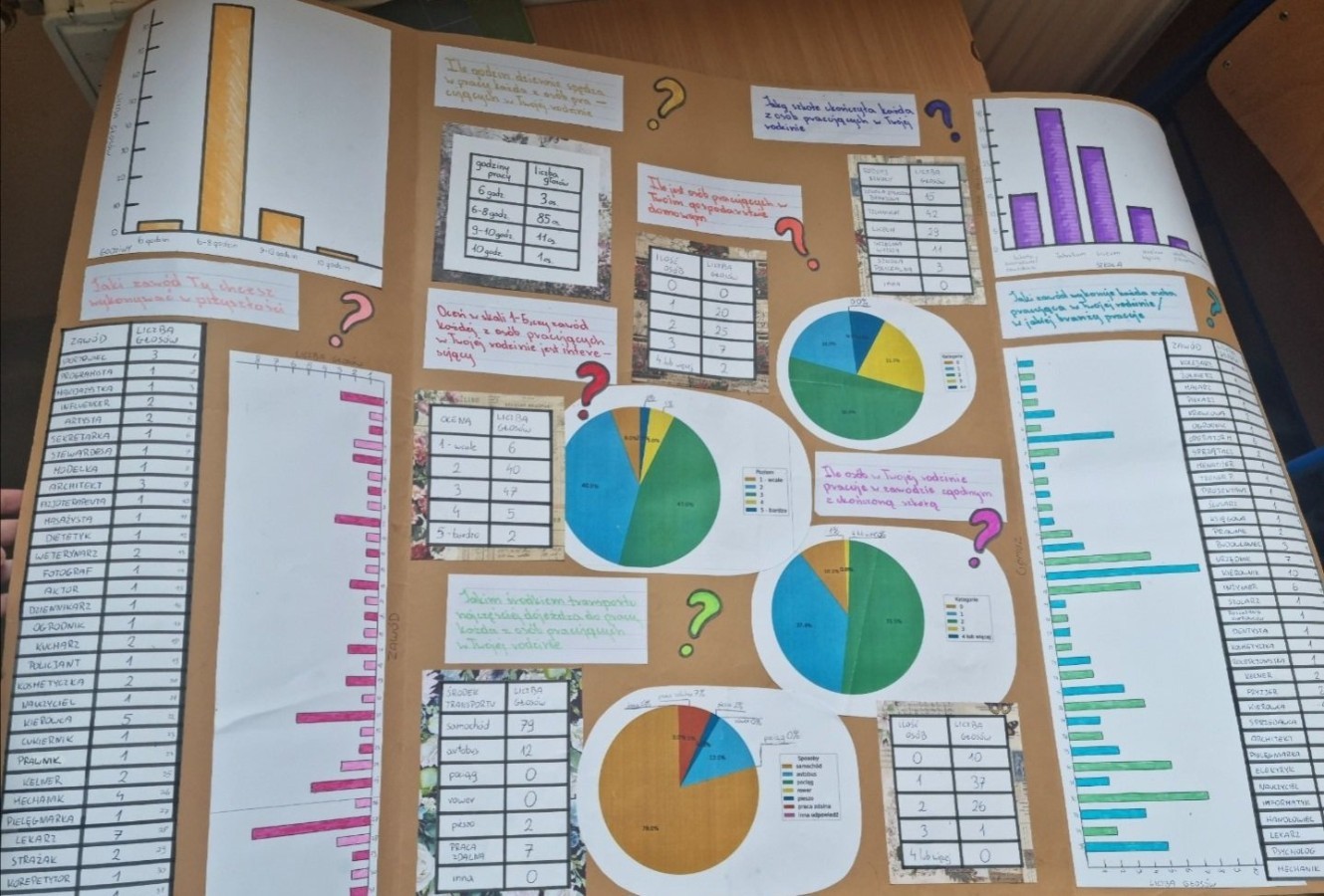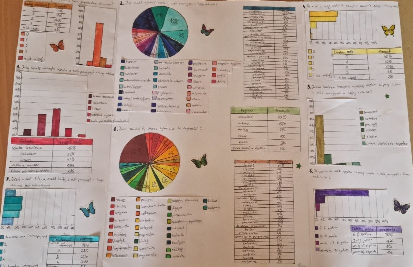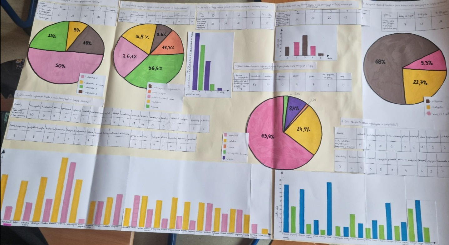Zebrane dane uczniowie przedstawiali w postaci tabel, wykresów oraz diagramów, ćwicząc tym samym umiejętność analizy i graficznej prezentacji informacji. Dzięki temu projekt miał nie tylko charakter poznawczy, ale również rozwijał kompetencje matematyczne i techniczne.
