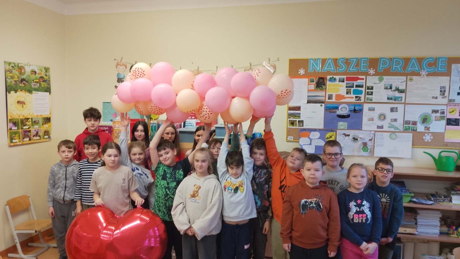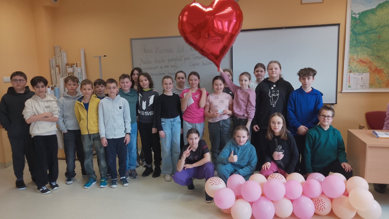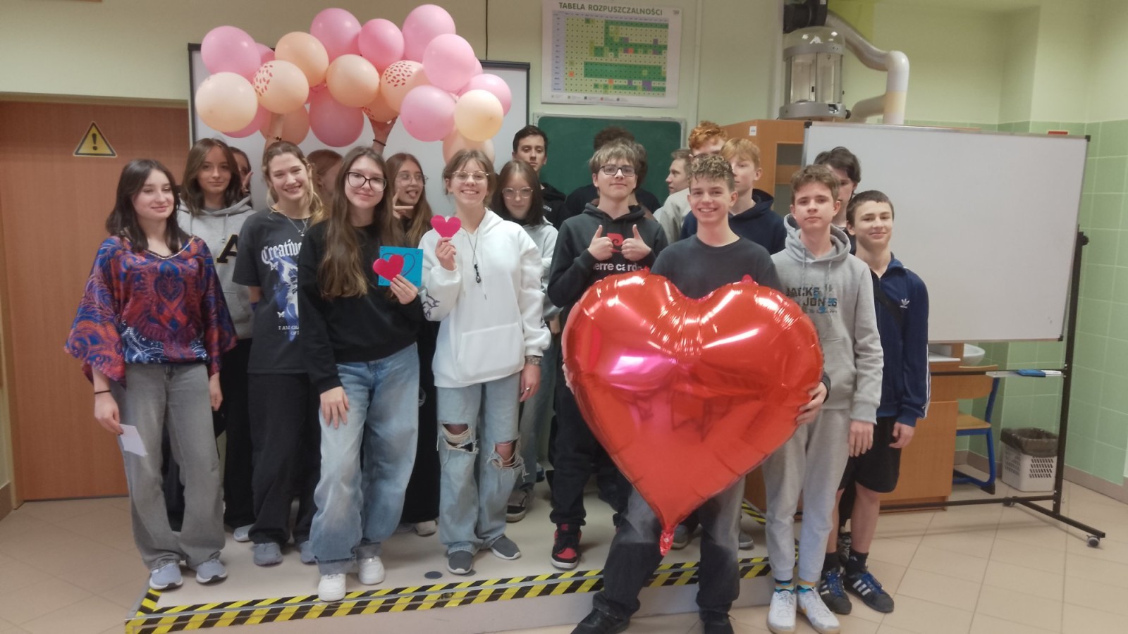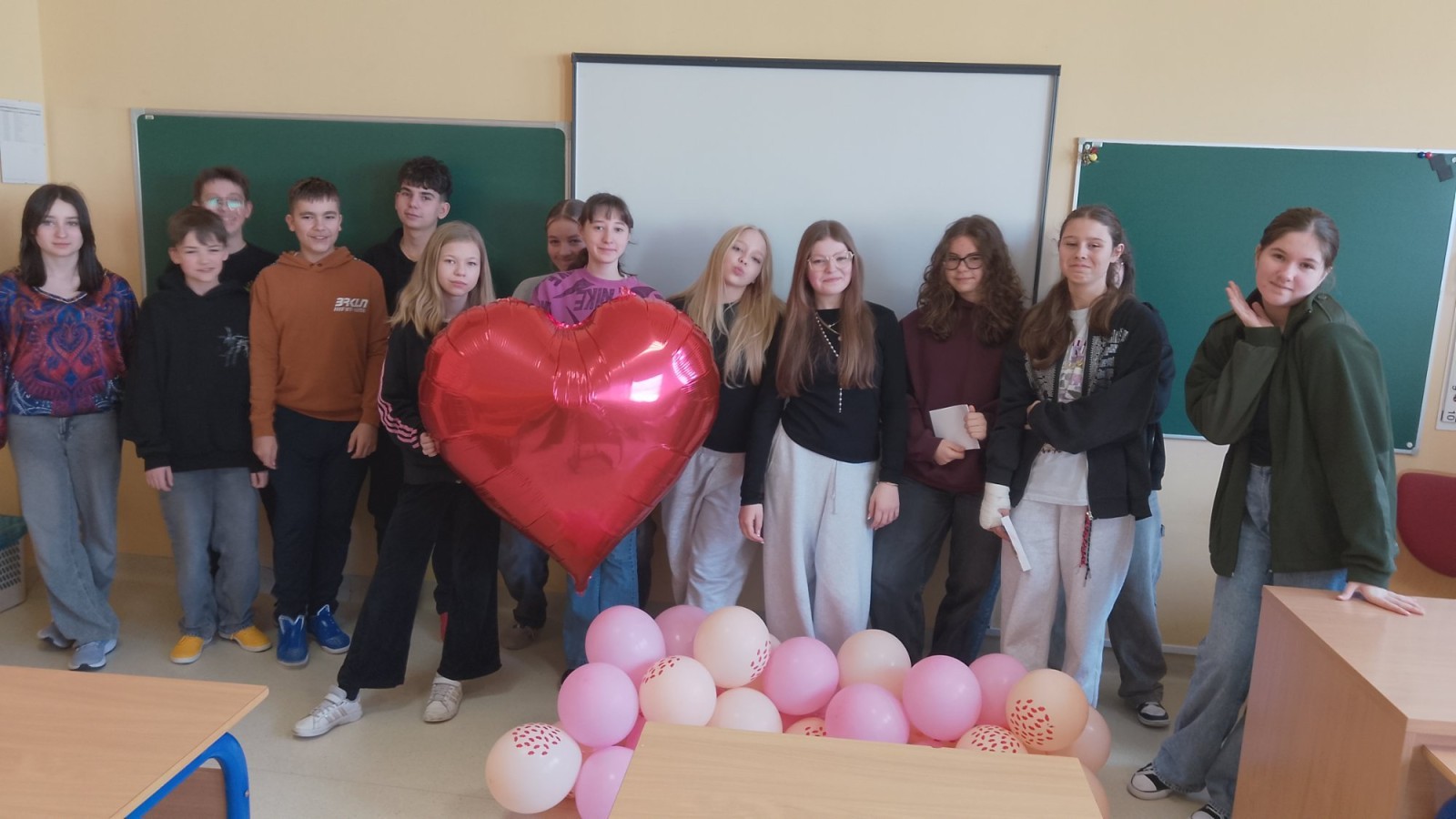 Liczba przygotowanych kartek była imponująca! Rozdawanie walentynek wywołało mnóstwo uśmiechów i radości w całej szkole. Dodatkową atrakcją była pamiątkowa sesja zdjęciowa – każda klasa mogła zapozować z naszym dużym, walentynkowym sercem.