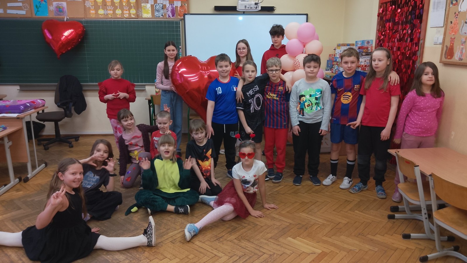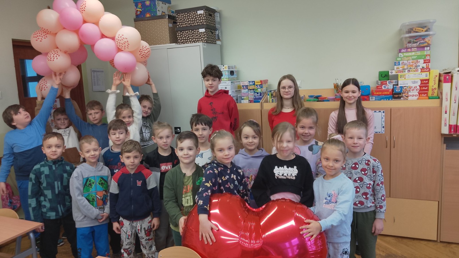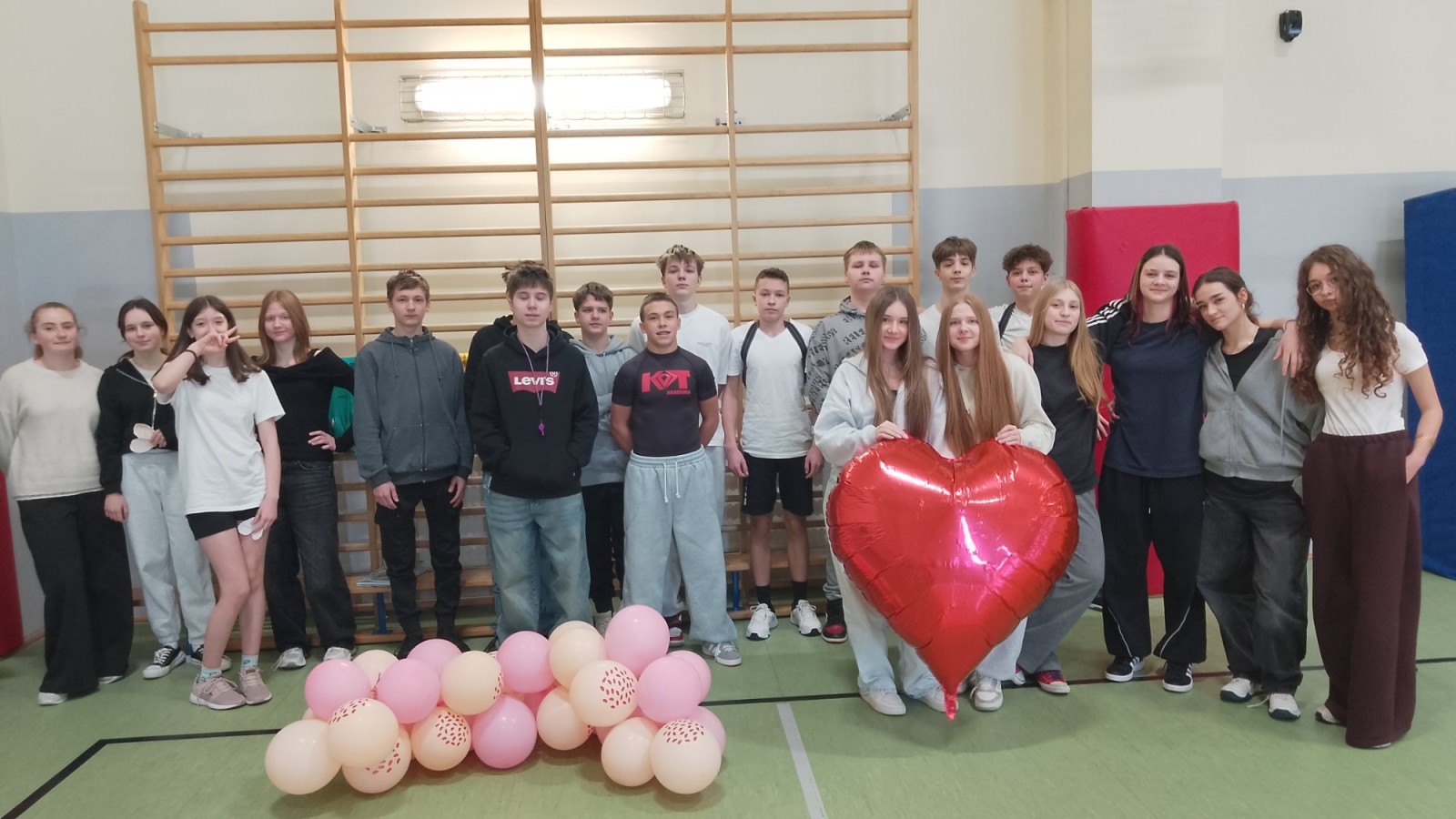 Liczba przygotowanych kartek była imponująca! Rozdawanie walentynek wywołało mnóstwo uśmiechów i radości w całej szkole. Dodatkową atrakcją była pamiątkowa sesja zdjęciowa – każda klasa mogła zapozować z naszym dużym, walentynkowym sercem.