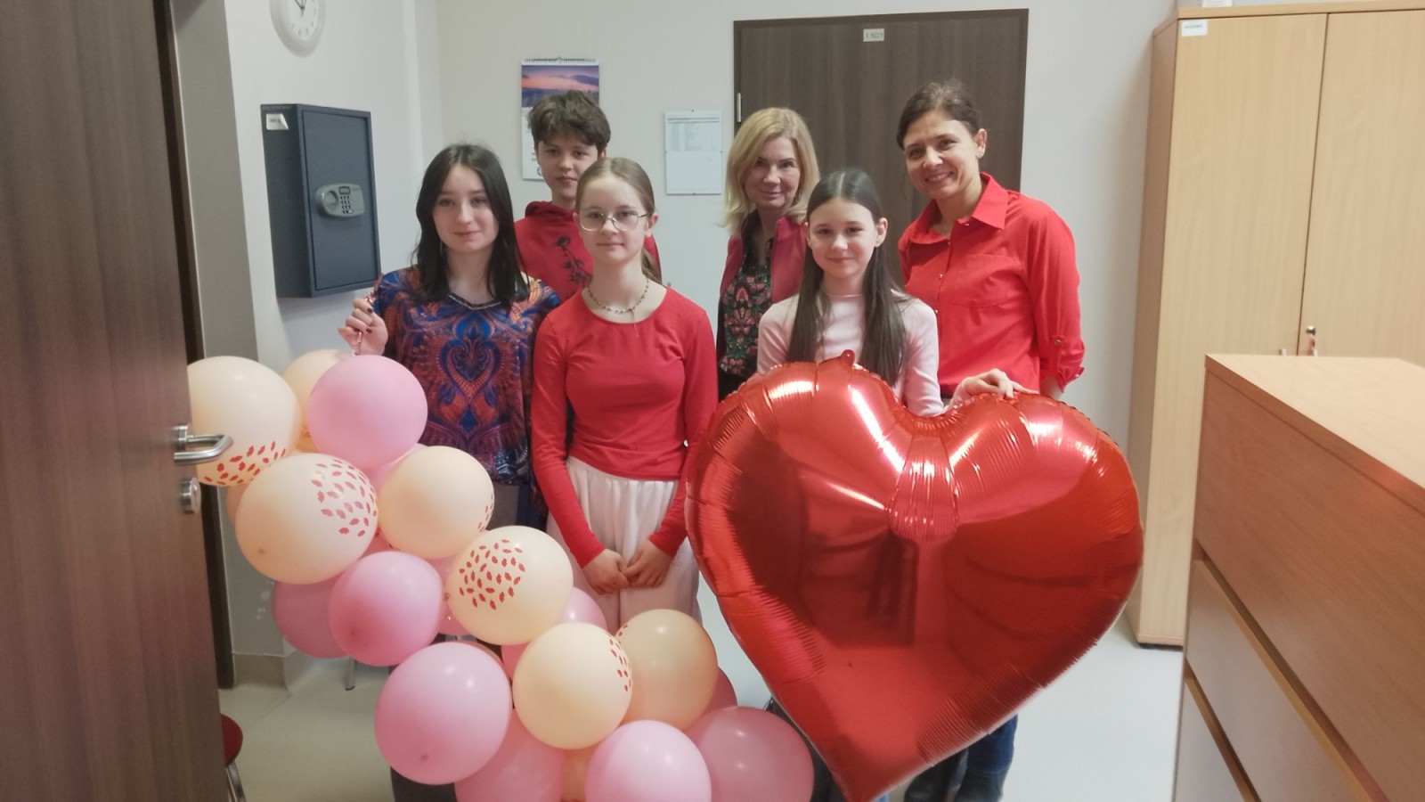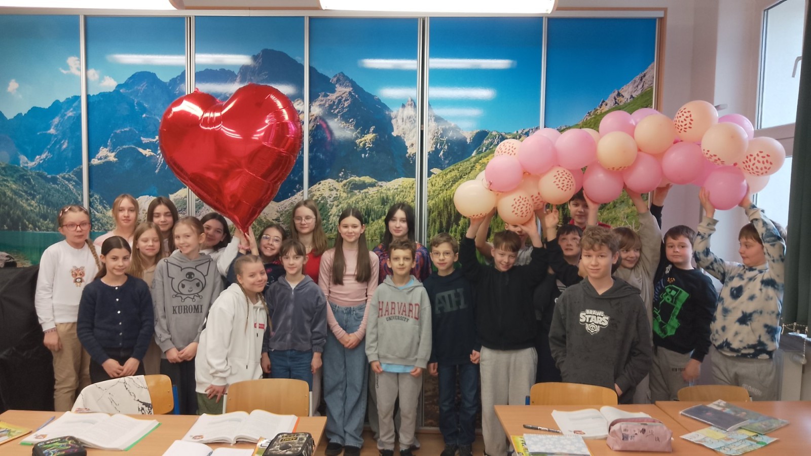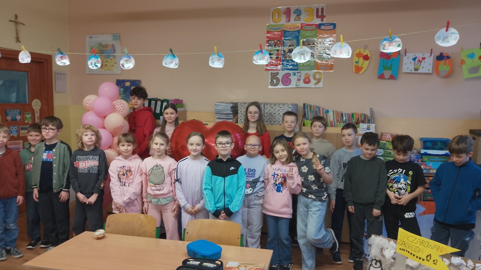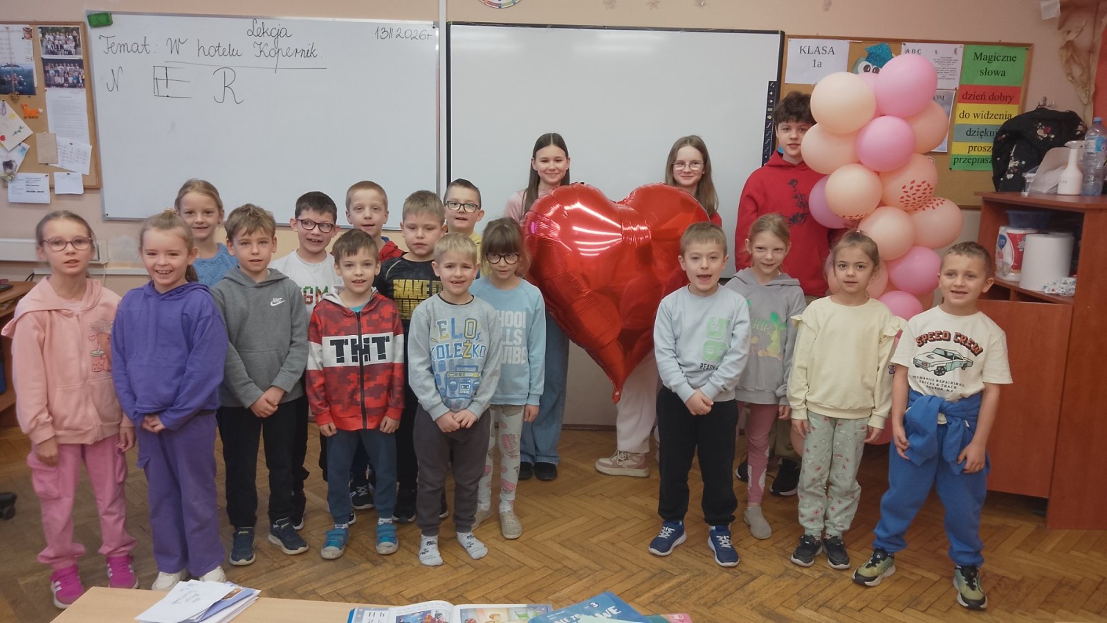 Liczba przygotowanych kartek była imponująca! Rozdawanie walentynek wywołało mnóstwo uśmiechów i radości w całej szkole. Dodatkową atrakcją była pamiątkowa sesja zdjęciowa – każda klasa mogła zapozować z naszym dużym, walentynkowym sercem.