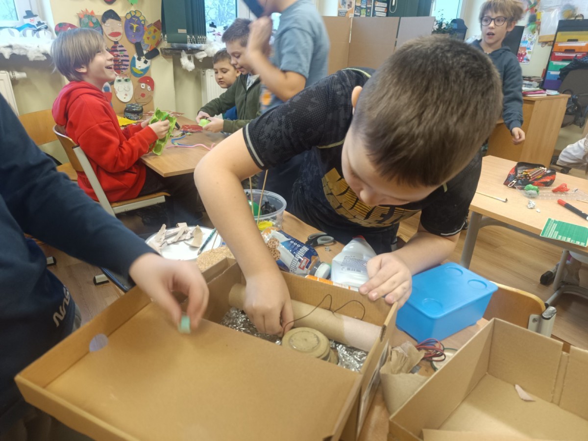 Uczniowie klasy 3a w ramach lekcji „Jak działa prąd oraz jak go oszczędzać?” stworzyli modele eko-urządzeń elektrycznych według własnych pomysłów, wykorzystując materiały recyklingowe. Uczniowie wykazali się dużą kreatywnością, pomysłowością oraz świadomością ekologiczną, pokazując, że nauka może łączyć się z troską o środowisko i praktycznym działaniem.