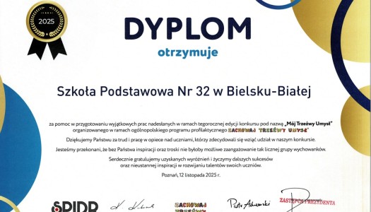 Nasza Szkołą otrzymała dyplom uznania za zaangażowanie w przygotowanie wyjątkowych prac nadesłanych w ramach ogólnopolskiego konkursu „Mój T...