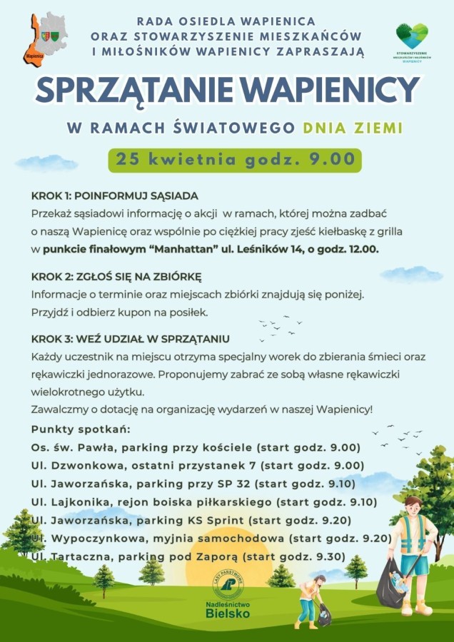 Rada Osiedla Wapienica w sobotę 25 kwietnia o godz. 9:00 organizuje sprzątanie Wapienicy. Organizator zapewnia rękawice jednorazowe i worki na śmieci. A po zakończeniu o 12:00 dla uczestników akcji darmowe ognisko z kiełbaskami na "Manhattanie". Szczegóły na plakacie w załączniku.