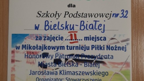 W dniu 12.12.2025 r. uczniowie Naszej Szkoły wzięli udział w finale Mikołajkowego Turnieju Piłki Nożnej pod patronatem Prezydenta Miasta Bielska-Białej. Nasza drużyna zajęła 2 miejsce. Dodatkowo najlepszym bramkarzem został Borek Sebastian, a najlepszym napastnikiem Fryczkowski Michał.